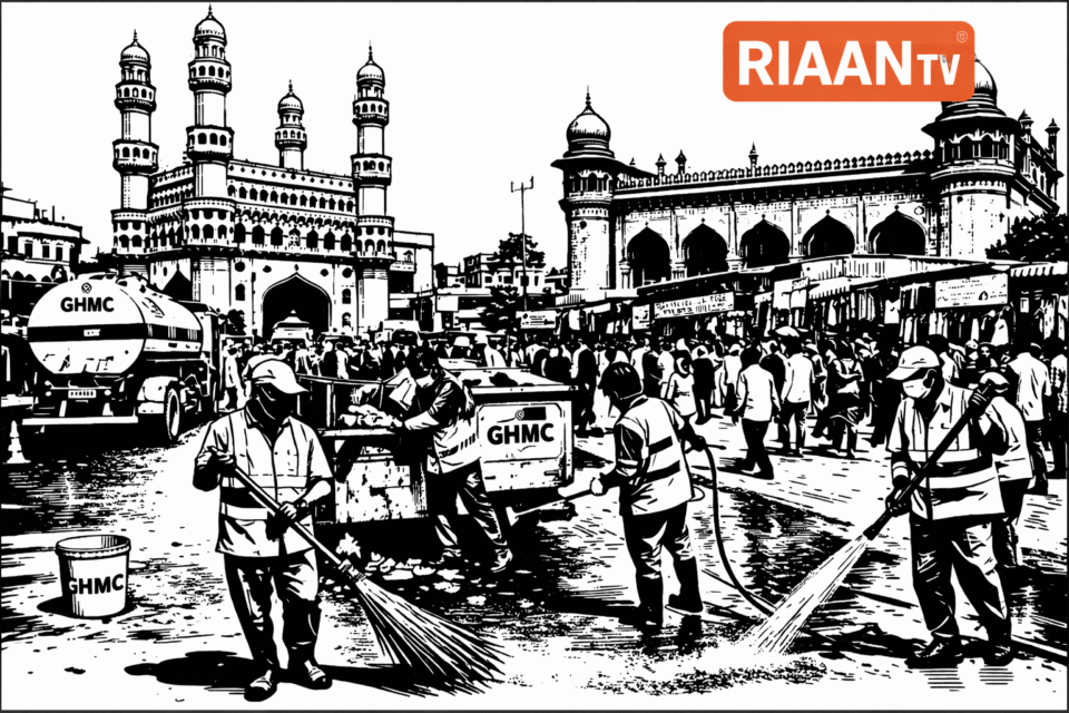 GHMC Commissioner R.V. Karnan inspected the surroundings of the monument and reviewed sanitation works at Mecca Masjid, Madina and nearby areas, which witness large public gatherings during the month. Officials were instructed to maintain cleanliness of roads and junctions during the period.